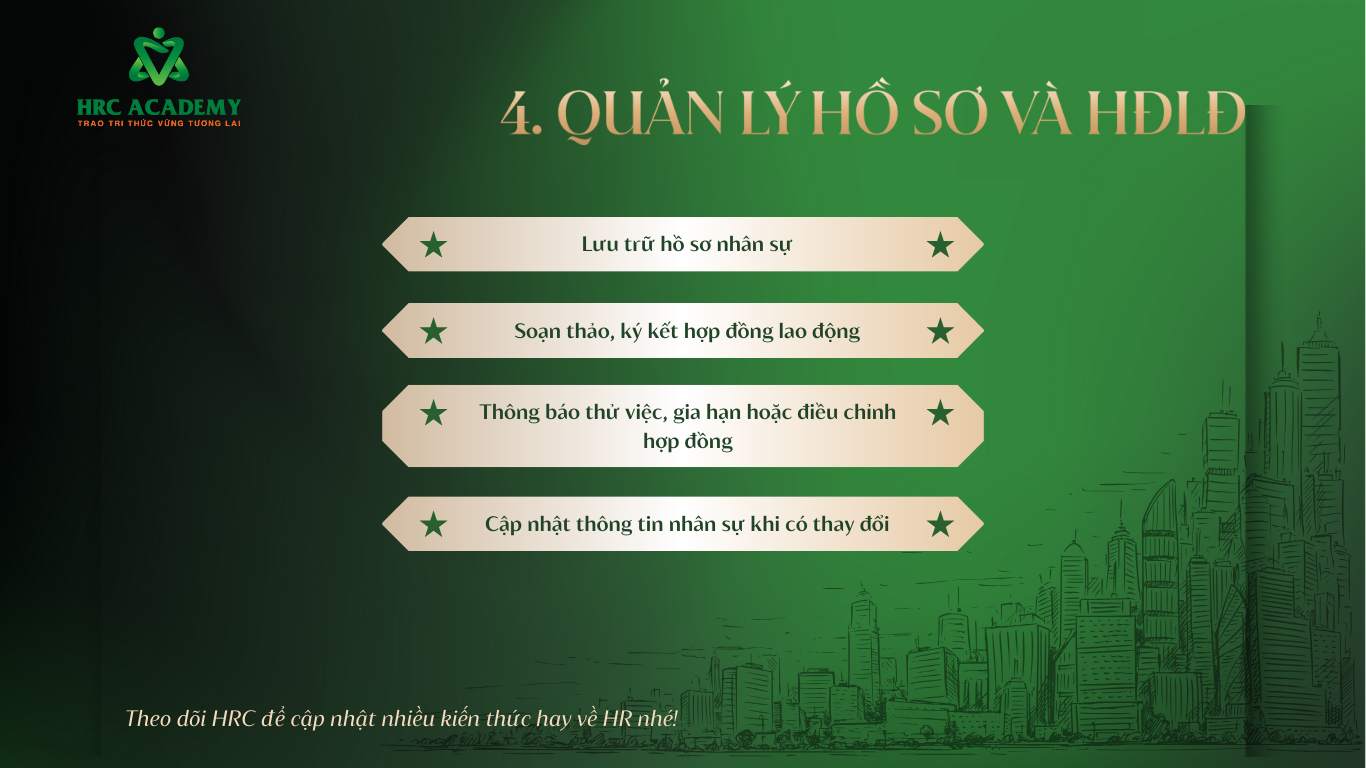 Hồ sơ và hợp đồng là nền tảng pháp lý của quan hệ lao động. HCNS tổng hợp chịu trách nhiệm lưu trữ, cập nhật hồ sơ nhân viên, theo dõi thời gian thử việc, ký kết hợp đồng lao động và soạn thảo các văn bản liên quan.