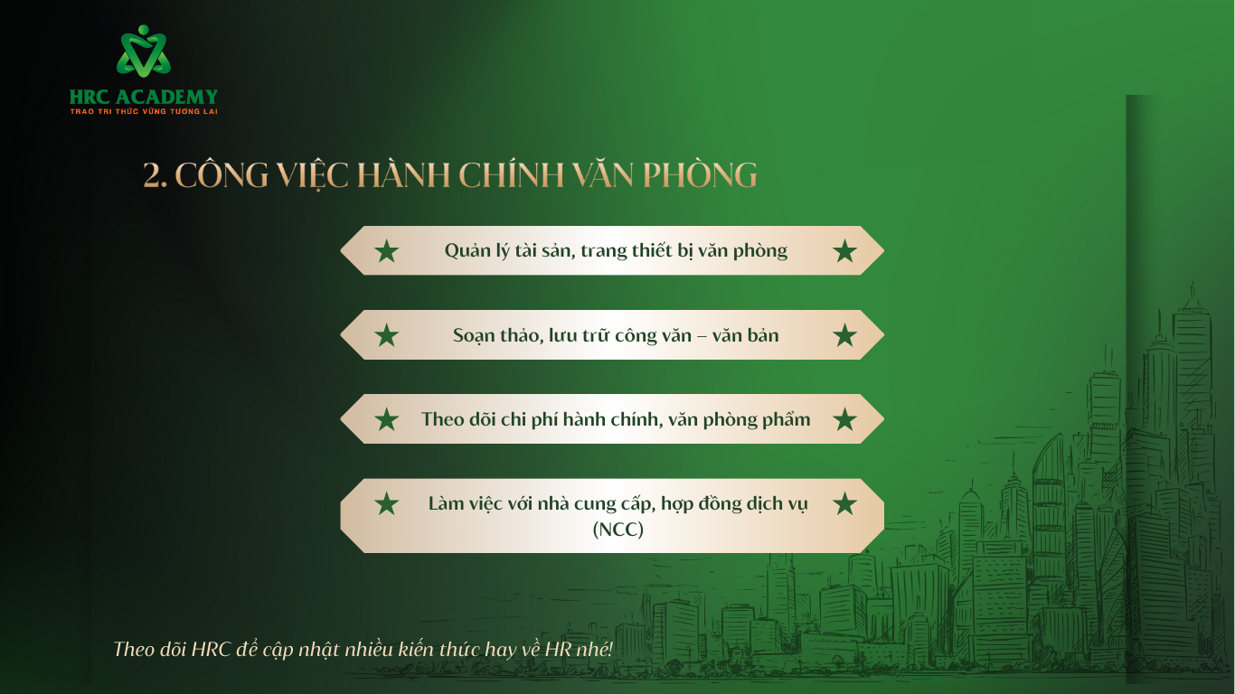 Hành chính là mảng công việc thầm lặng nhưng đóng vai trò cực kỳ quan trọng. Với HCNS tổng hợp, hành chính bao gồm quản lý tài sản, theo dõi công văn đến – đi, quản lý văn phòng phẩm, chi phí hành chính và làm việc với các nhà cung cấp dịch vụ.