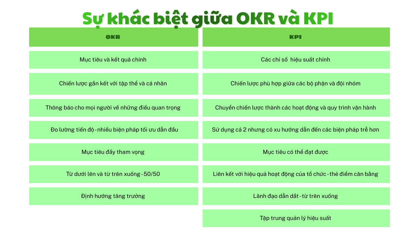 Nói một cách đơn giản, KPI đo lường hiệu suất hiện tại, OKR thúc đẩy sự thay đổi để đạt hiệu suất tốt hơn trong tương lai.