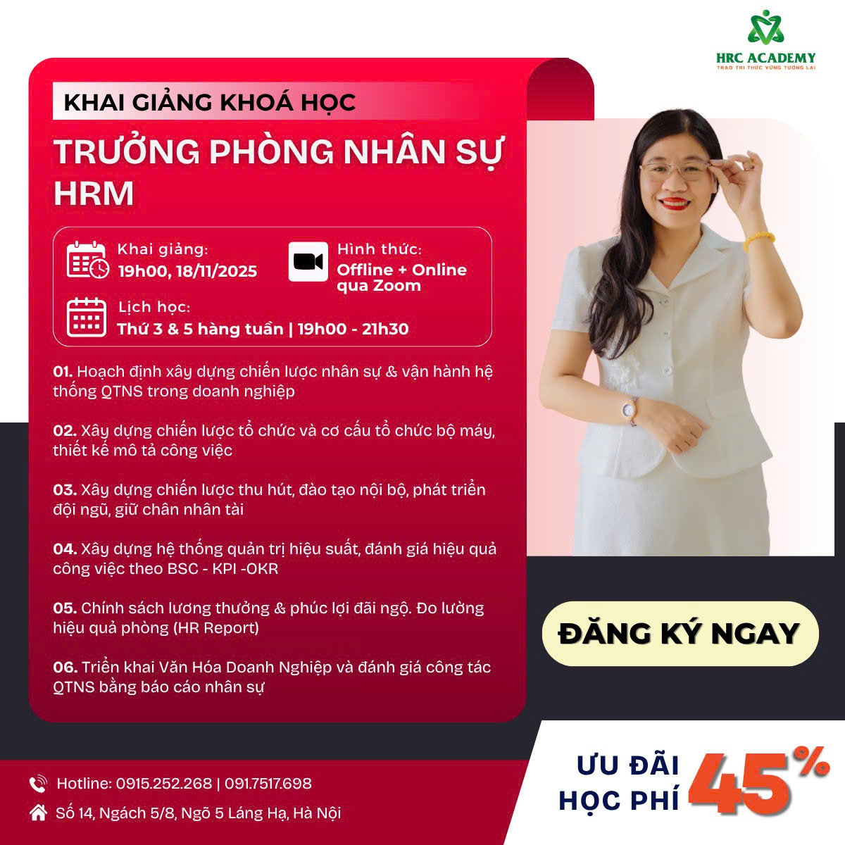 HRC Academy trân trọng thông báo khai giảng khóa học “Trưởng phòng Nhân sự – HRM” vào tối ngày 18/11.