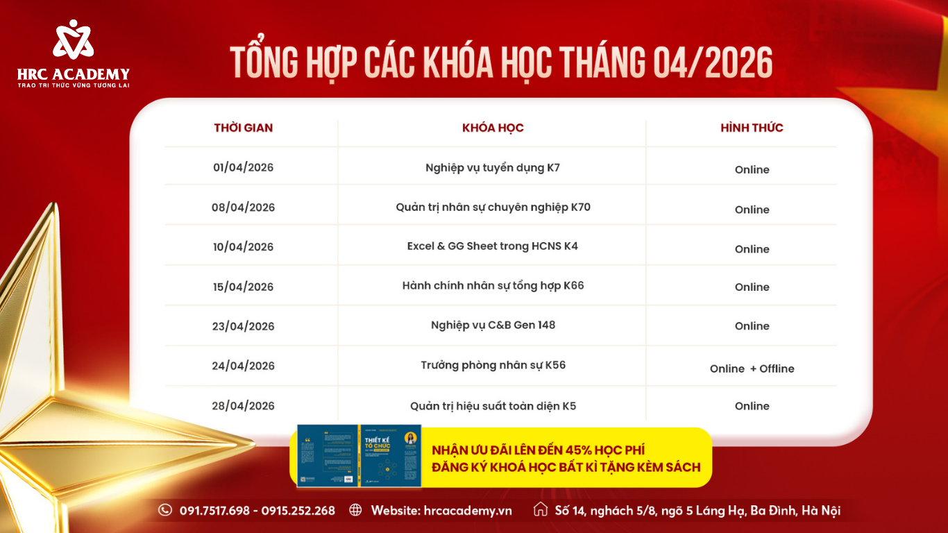 Bạn đang tìm kiếm cơ hội nâng cao kỹ năng quản trị nhân sự (HR)? HRC Academy chính thức công bố các khóa học chuyên sâu sẽ khai giảng trong tháng 4 năm 2026 với chương trình giảng dạy được thiết kế để chuẩn hóa đội ngũ và nâng cao hiệu quả tổ chức.