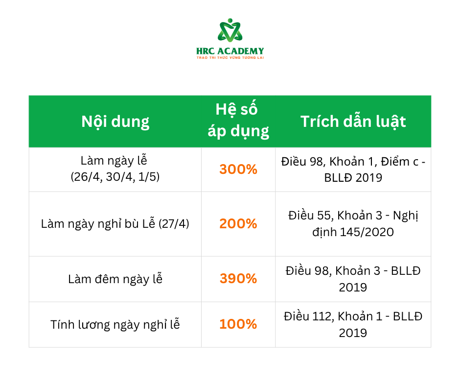 Áp dụng cho Người lao động (NLĐ) hưởng lương tháng (đã có 100% lương ngày nghỉ lễ theo Điều 112 BLLĐ):