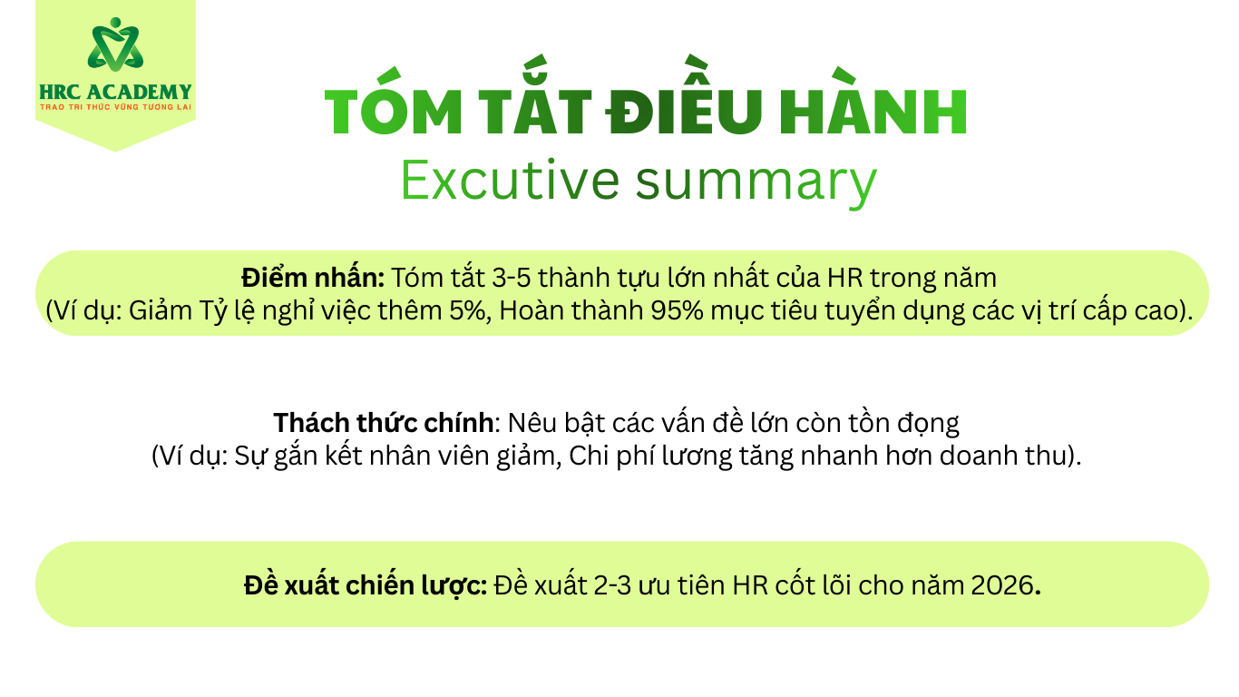 Ngoài ra, Executive Summary cần đề xuất các ưu tiên chiến lược cho năm 2026. Đây nên là những định hướng quan trọng có tác động toàn doanh nghiệp như đẩy mạnh đào tạo nâng cao kỹ năng mới, chuẩn hóa quy trình tuyển dụng theo hướng ứng dụng AI, cải thiện trải nghiệm nhân viên hoặc xây dựng hệ thống dữ liệu nhân sự tập trung để tăng hiệu quả phân tích. Các đề xuất phải phù hợp với bối cảnh kinh doanh, năng lực hiện tại của tổ chức và những xu hướng mới của thị trường lao động.